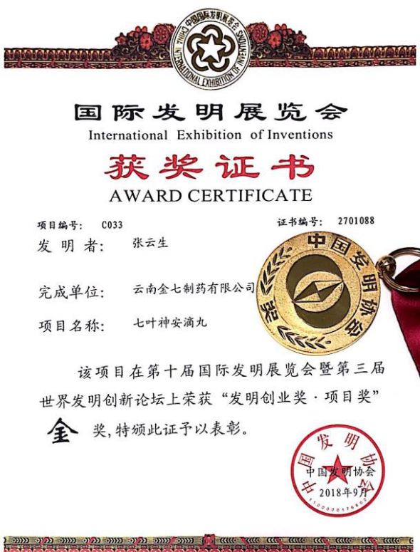 云南省知识产权局、云南省发明协会共组织13户企业24个项目参加此次展会,其中楚雄高新区选送的3户企业的4项优秀发明成果在本次展会中斩获金奖。云南金七制药有限公司“金三奇牌三七口服液”和“七叶神安滴丸”项目、云南摩尔农庄生物技术开发有限公司的“核桃乳植物蛋白饮料加工新技术”项目、云南楚雄天利药业有限公司的“红花逍遥胶囊产业化开发”项目4个项目的获奖,其研发实力充分得到国际的认可。